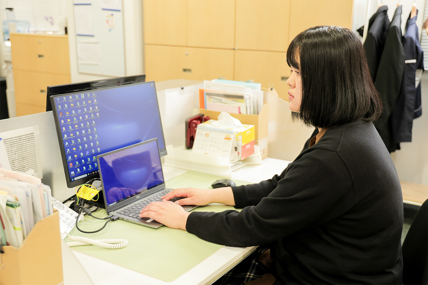 日によって異なりますが、各事業所とのやり取りや社内調整。経理関係の業務など朝に決めたスケジュールに沿って対応して行きます。